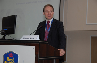 С докладом «Руководство и опыт работы по биосимилярям в Европейском Союзе» о системе регистрации биологических препаратов и биосимиляров выступил Д-р Мартин Клаус, Старший директор компании «Polpharma Biologics», осуществляющий управление глобальным бизнесом и деятельностью по развитию продуктов. Он подробно остановился на вопросах регистрации, директивных документам ЕМА, также основных вопросах, связанных с экстраполяцией показаний для биосимиляров.