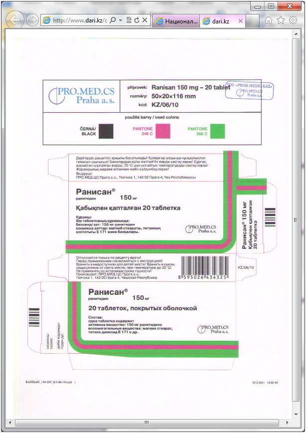 Затем надо ввести в поле поиска название препарата, например, «Ранисан». И система выдаст всю необходимую для вас информацию – где и кем произведен препарат, каковы его характеристики, покажет макет упаковки, разрешенной на территории РК, инструкцию по применению, номера серий препарата, прошедших оценку безопасности и качества в РК и пр. Все это наглядно видно на приведенных ниже слайдах: