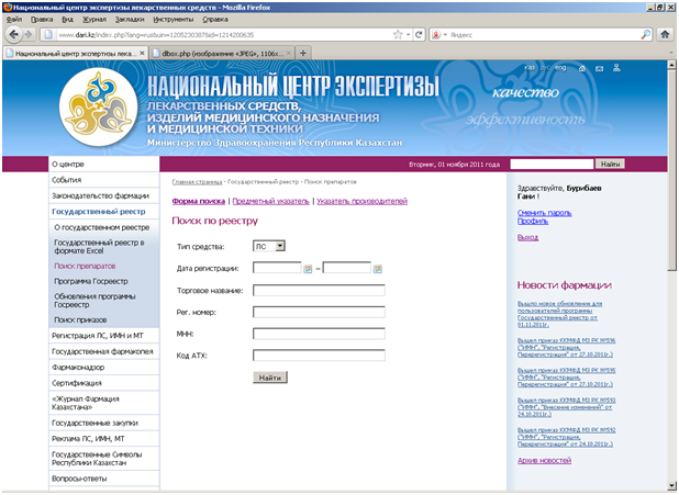 С этой цель мы разместили на сайте Национального центра экспертизы лекарственных средств, изделий медицинского назначения и медицинской техники www.dari.kz Государственный реестр лекарственных средств, изделий медицинского назначения и медицинской техники. Любой посетитель найдет здесь полную информацию по всем зарегистрированным в Республике Казахстан отечественным и зарубежным лекарственным средствам, изделиям медицинского назначения и медицинской технике, разрешенным к медицинскому применению и реализации на территории республики.