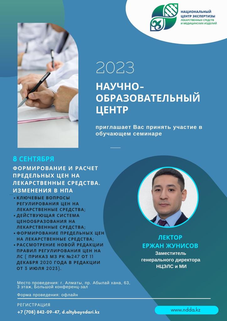 02.09.2023Научно-образовательный центр РГП на ПХВ «Национальный центр экспертизы лекарственных средств и медицинских изделий» КМ и ФК МЗ РК 8 сентября 2023 г. приглашает Вас принять участие в обучающем семинаре Заместителя генерального директора НЦЭЛС и МИ Ержана Жунисова на тему: «Формирование и расчет предельных цен на лекарственные средства. Изменения в НПА».