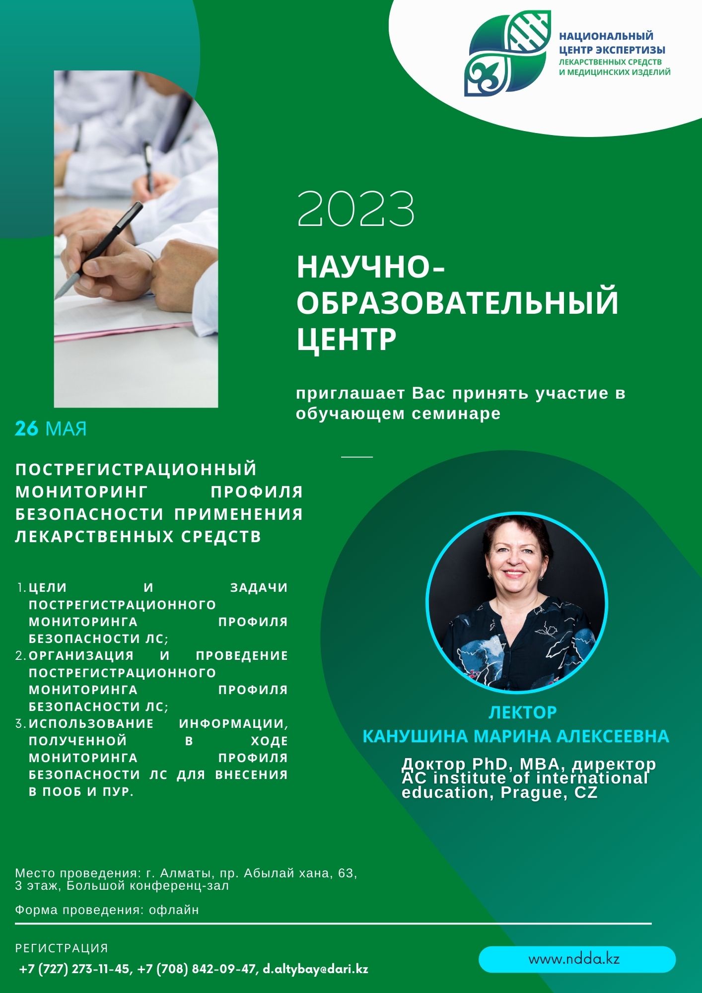 Научно-образовательный центр РГП на ПХВ «Национальный центр экспертизы лекарственных средств и медицинских изделий» КМ и ФК МЗ РК 26 мая 2023 г. приглашает Вас принять участие в обучающем семинаре Доктора PhD, MBA, директора AC institute of international education, Prague, CZ, Канушиной М.А. на тему «Пострегистрационный мониторинг профиля безопасности применения лекарственных средств».