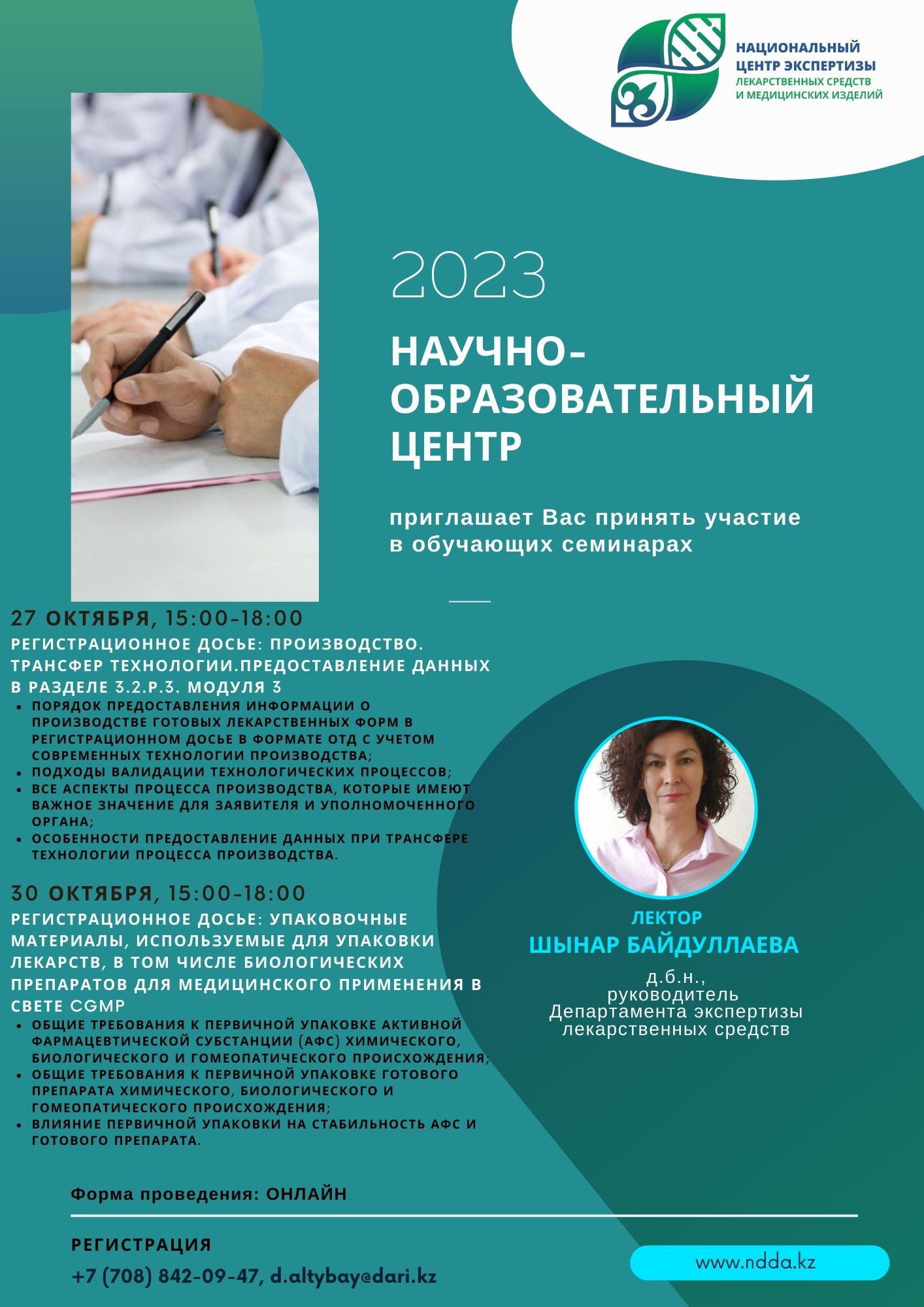 19.10.2023Научно-образовательный центр РГП на ПХВ «Национальный центр экспертизы лекарственных средств и медицинских изделий» КМ и ФК МЗ РК 27, 30 октября 2023 г. приглашает Вас принять участие в онлайн формате в обучающих семинарах к.б.н., руководителя Департамента экспертизы лекарственных средств, доктора биологических наук Шынар Байдуллаевой на темы: