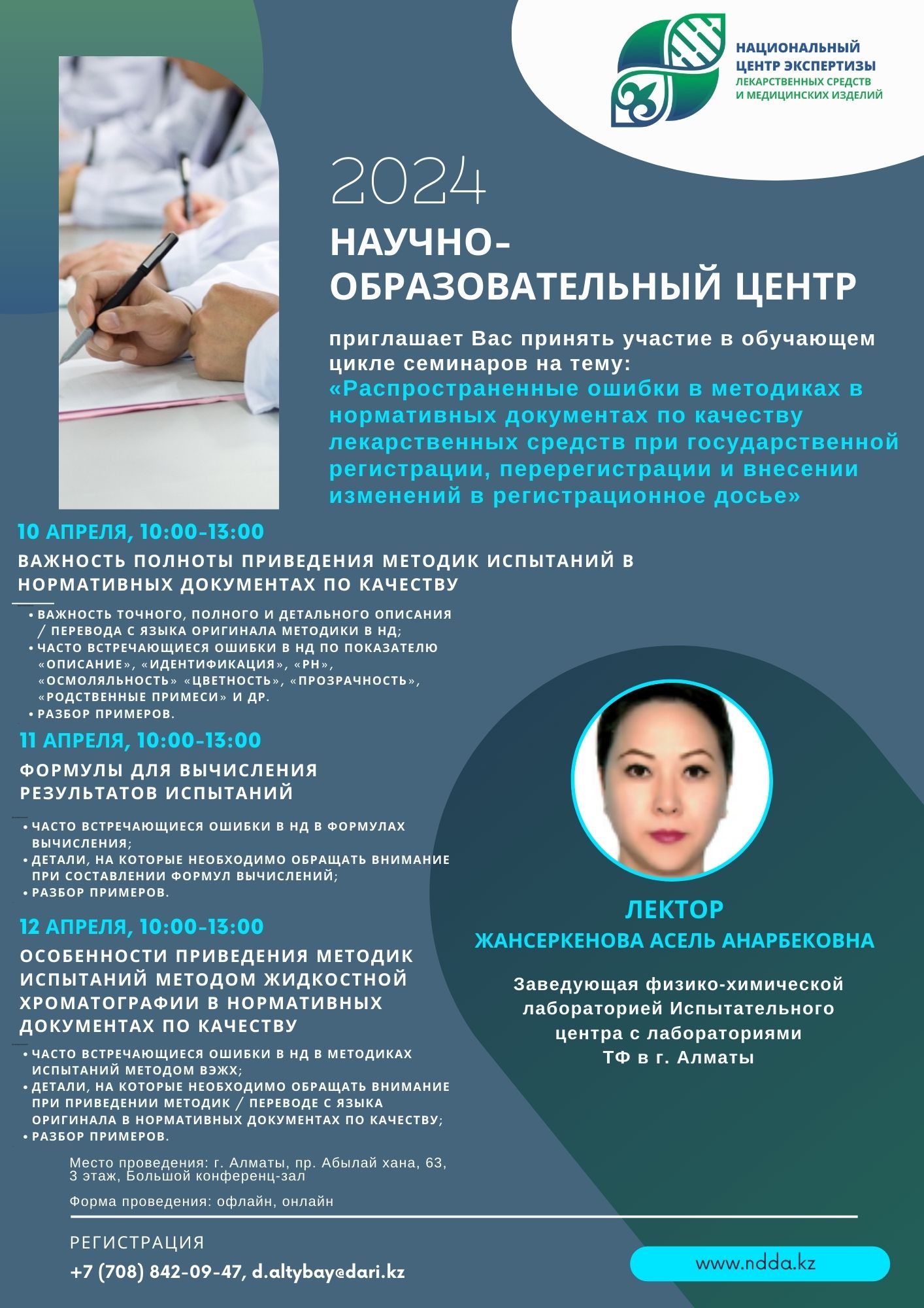28.03.2024Научно-образовательный центр РГП на ПХВ «Национальный центр экспертизы лекарственных средств и медицинских изделий» КМ и ФК МЗ РК 10-12 апреля 2024 г. приглашает Вас принять участие в обучающем цикле семинаров заведующего Физико-химической лабораторией Испытательного центра с лабораториями Асель Жансеркеновой на тему: «Распространенные ошибки в методиках в нормативных документах по качеству лекарственных средств при государственной регистрации, перерегистрации и внесении изменений в регистрационное досье»
