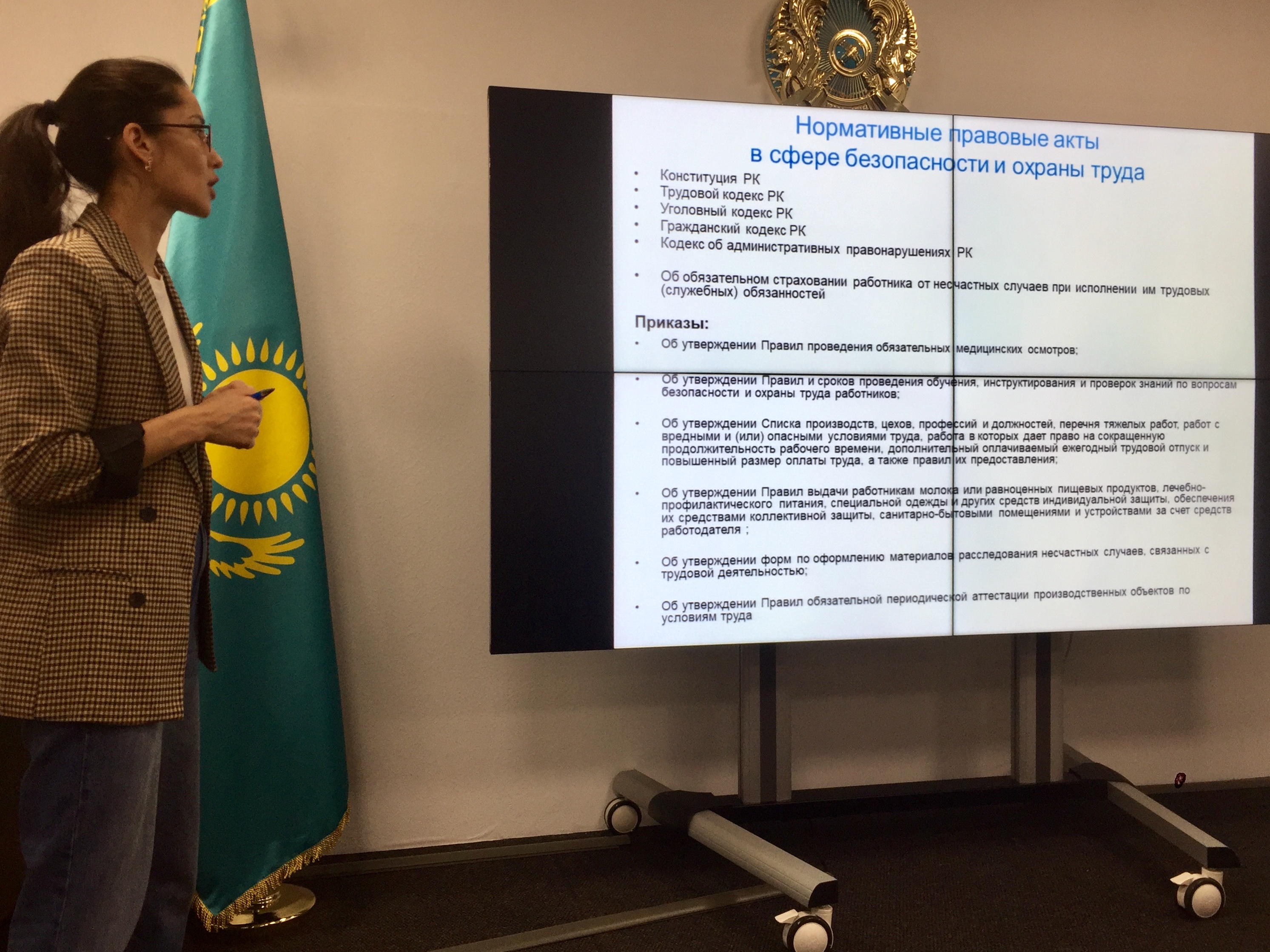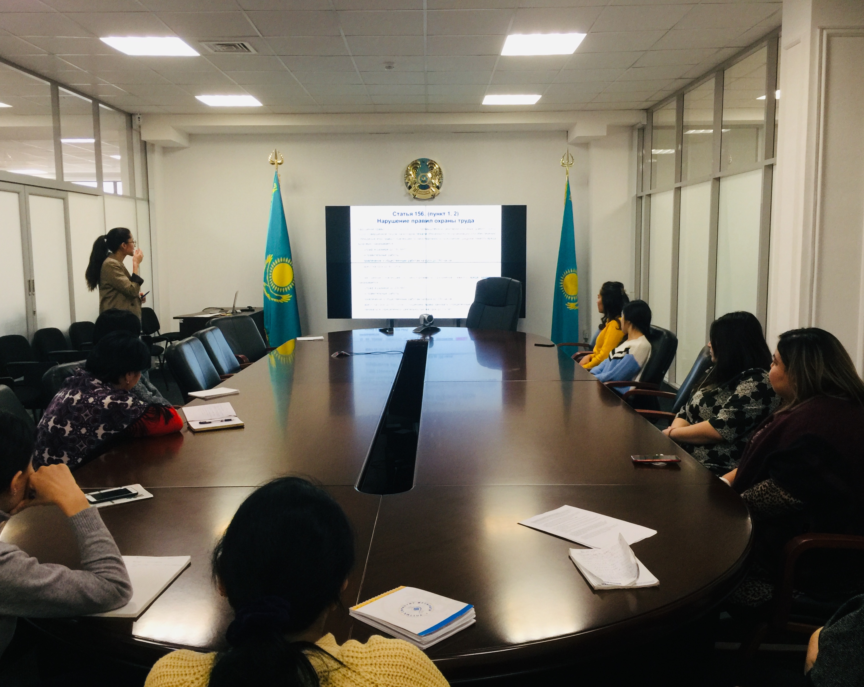 12.12.2019Лекцию на тему «Безопасность и охрана труда» провела специалист Административного департамента НЦЭЛС Гульнара Оракбаева, которая рассказала сотрудникам предприятия о правах и обязанностях работника и работодателя в сфере безопасности и охраны труда, о необходимости соблюдения техники безопасности, а также ответила на вопросы участников встречи.