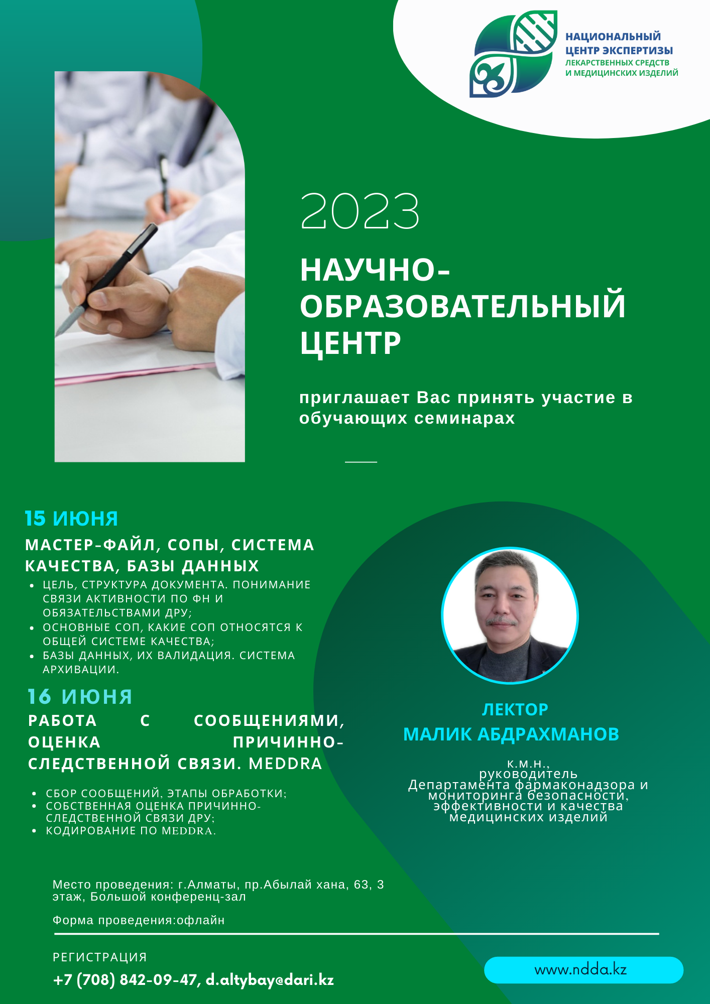 03.06.2023Научно-образовательный центр РГП на ПХВ «Национальный центр экспертизы лекарственных средств и медицинских изделий» КМ и ФК МЗ РК 15-16 июняприглашает принять участие в обучающих семинарах к.м.н., руководителя Департамента фармаконадзора и мониторинга безопасности, эффективности качества медицинских изделий Малика Абдрахманова.