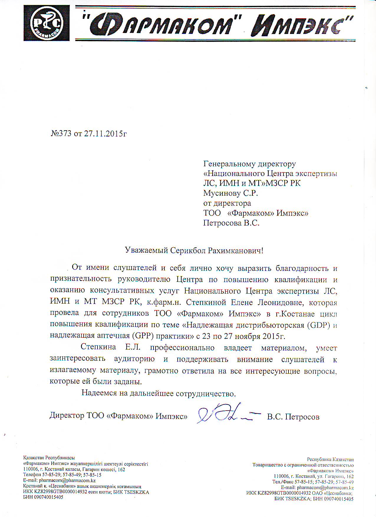 04.12.2015С 23 по 27 ноября текущего года Е.Л. СТЁПКИНОЙ, руководителем центра повышения квалификации и оказанию консультативных услуг НЦЭЛС, был проведен цикл лекций и семинарских занятий в целях повышения квалификации фармацевтических работников в г. Костанай.