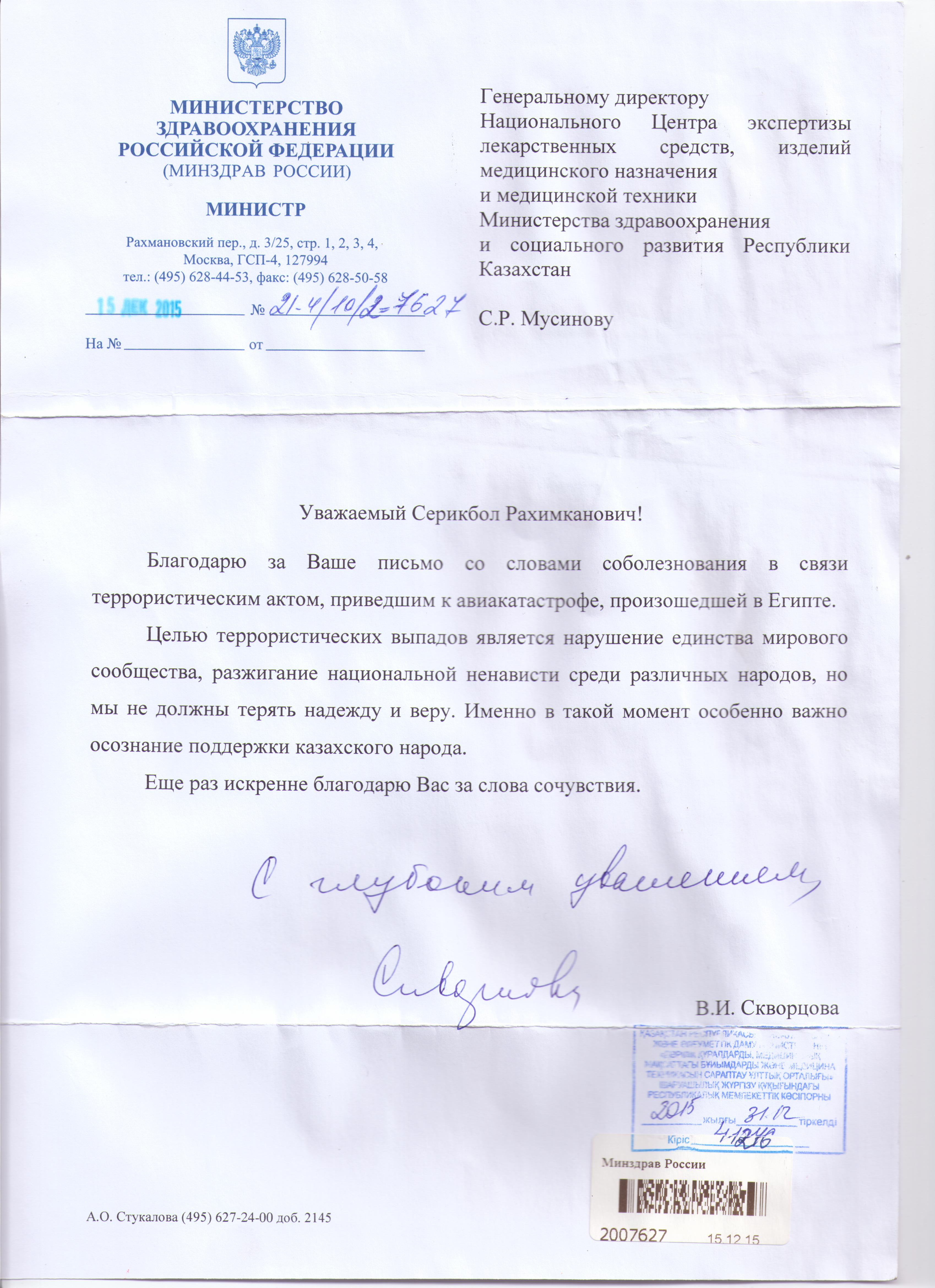 Ответ на письмо соболезнования Министра здравоохранения Российской Федерации Скворцовой В.И.