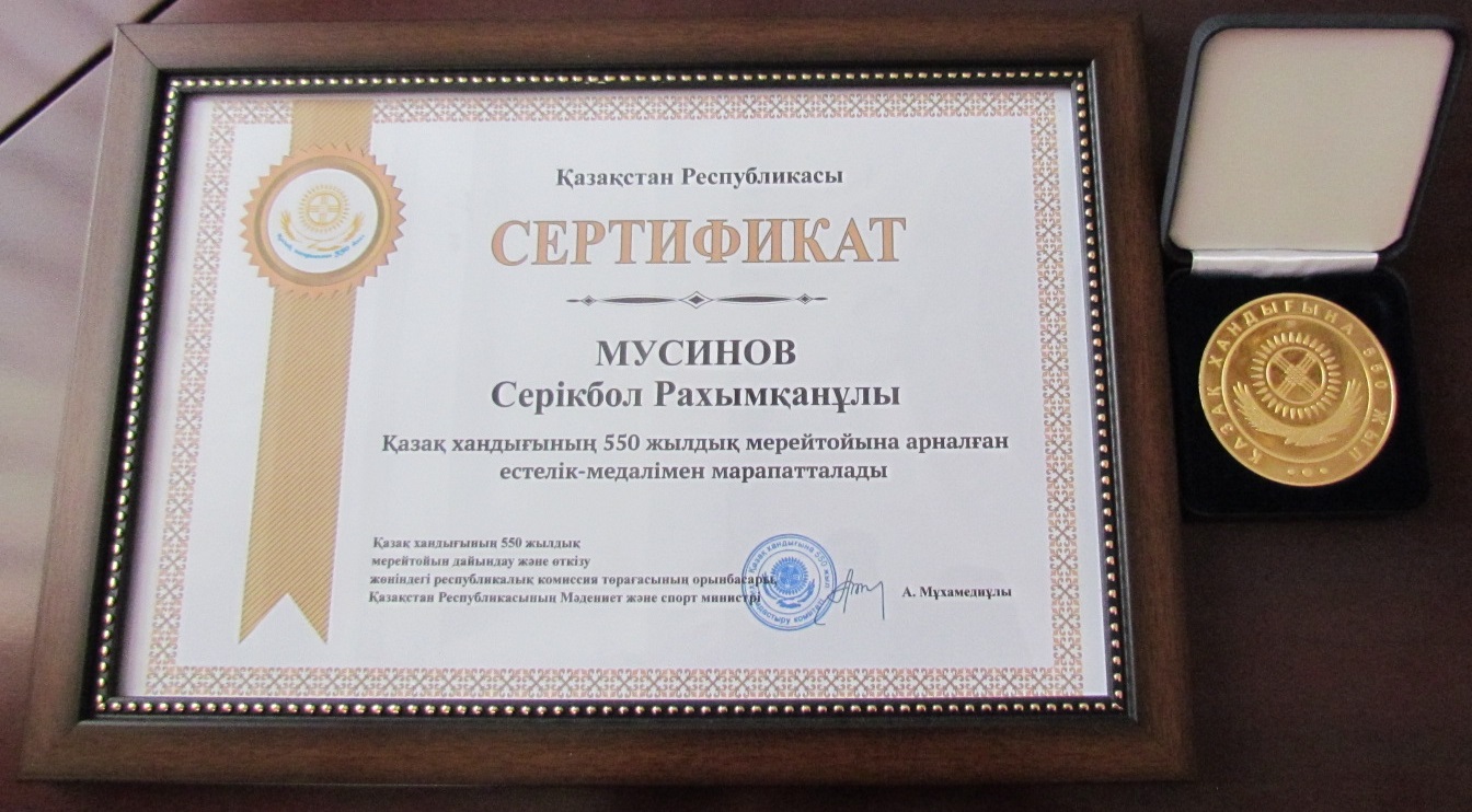 С.Р. Мусинову вручена памятная медаль «ҚАЗАҚСТАН ХАНДЫҒЫНА 550 ЖЫЛ»
